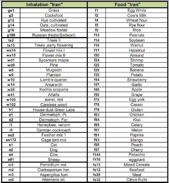 :شایعترین آلرژن های تنفسی و غذایی ایران که با توجه به نتایج پریک و مشاوره با آلرژیست ها لیست شده است
